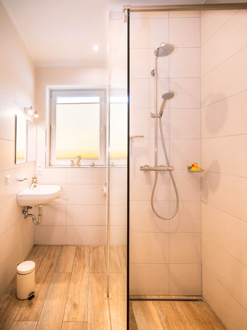 Über den Flur gelangt man in das moderne Badezimmer mit ebenerdiger Dusche, Waschtisch und WC. Die ruhige Lage zur Hofseite bietet ideale Voraussetzungen für einen entspannten Aufenthalt.