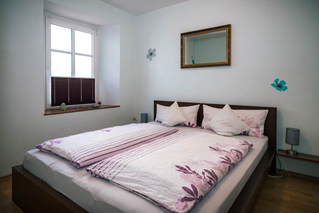 Im Schlafzimmer erwartet Sie ein komfortables Doppelbett und ausreichend Stauraum und der separate Ankleidebereich im Flur schafft zusätzlichen Platz.